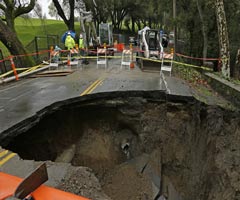 图为当地时间2017年1月18日,美国加州Orinda,当地遭强暴风雨袭击,道路出现大坑。