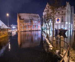 图为德国北部历史名城吕贝克的老城区被洪水包围。